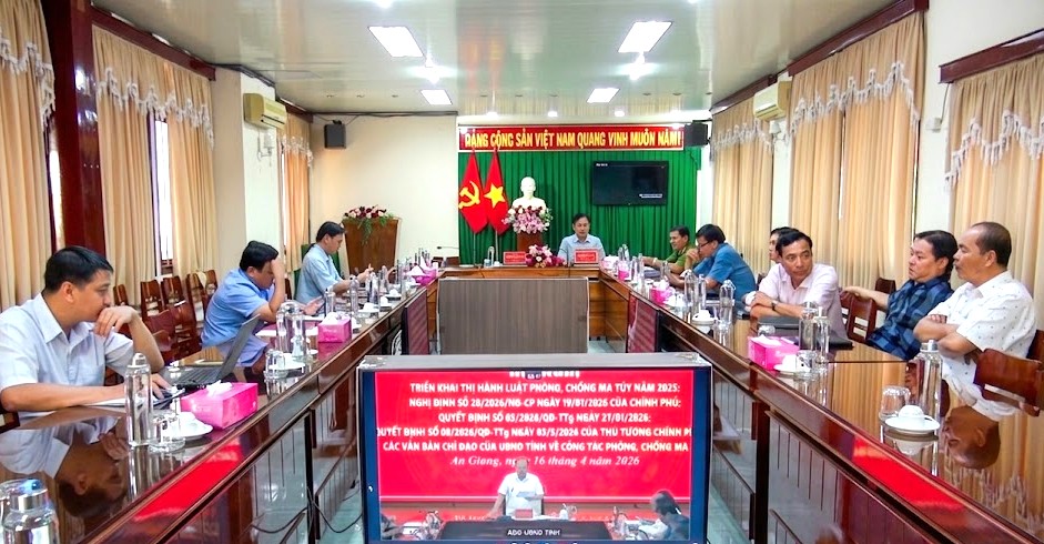 Sáng 16/4, UBND tỉnh An Giang tổ chức hội nghị triển khai thi hành Luật Phòng, chống ma túy năm 2025; Nghị định số 28/2026/NĐ-CP, ngày 19/1/2026; Quyết định số 05/2026/QĐ-TTg, ngày, 27/1/2026; Quyết định số 08/2026/QĐ-TTg, ngày 3/3/2026 của Thủ tướng Chính phủ và các văn bản chỉ đạo của UBND tỉnh về phòng, chống ma túy.