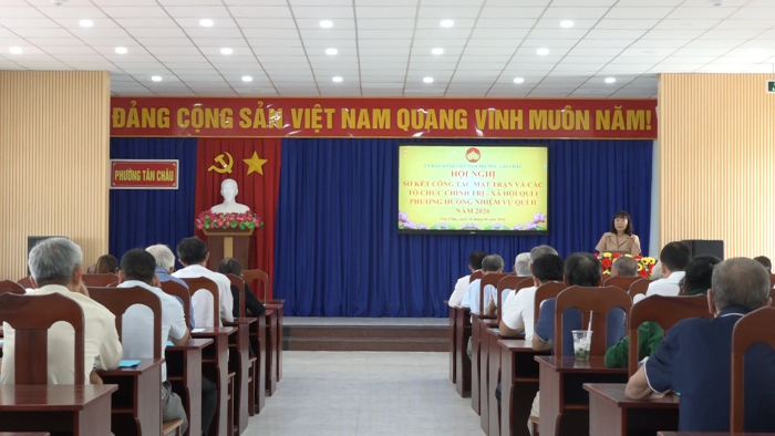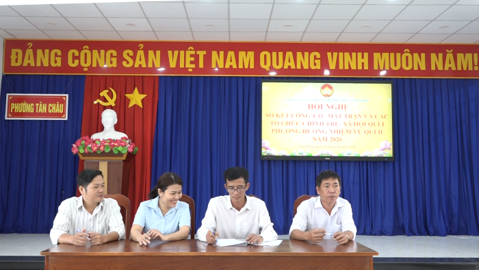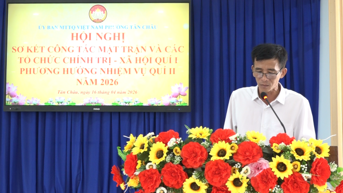 Sáng ngày 16/4/2026, Ban TT UBMTTQ Việt Nam phường Tân Châu tổ chức hội nghị sơ kết công tác mặt trận và các tổ chức chính trị - xã hội quý I và phương hướng nhiệm vụ quý II năm 2026. Đến dự có bà Võ Thị Kim Định, phó Bí thư TT Đảng uỷ phường; ông Lâm Giang Nam, Chủ tịch UBMTTQ Việt Nam phường; ông Lê Văn Long, phó chủ tịch HĐND phường.
