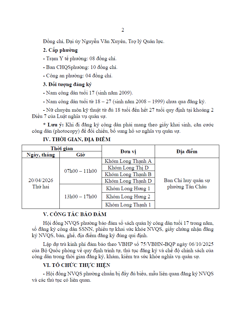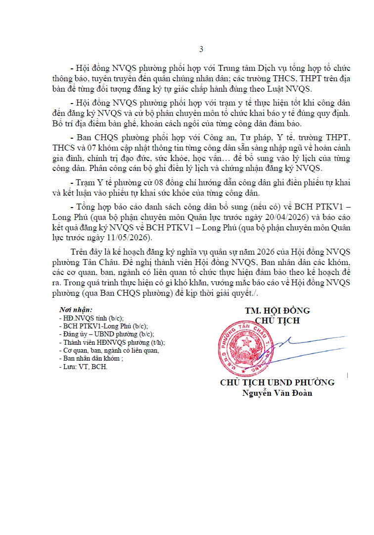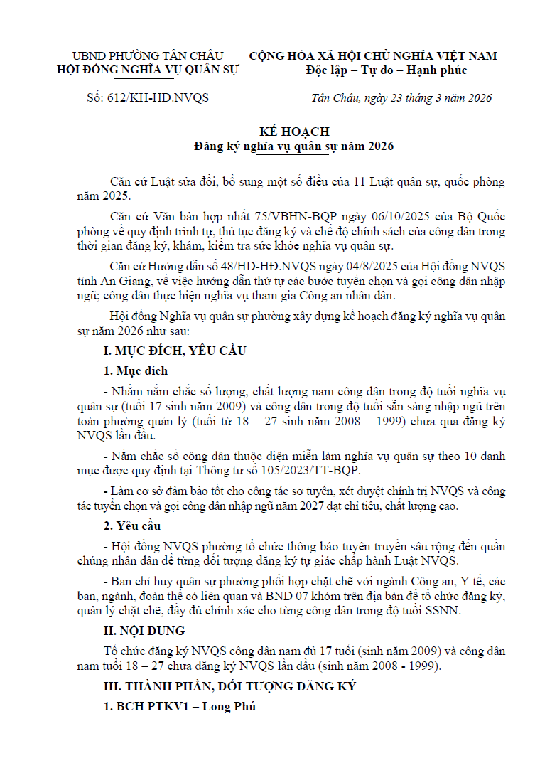 KẾ HOẠCH Đăng ký nghĩa vụ quân sự năm 2026