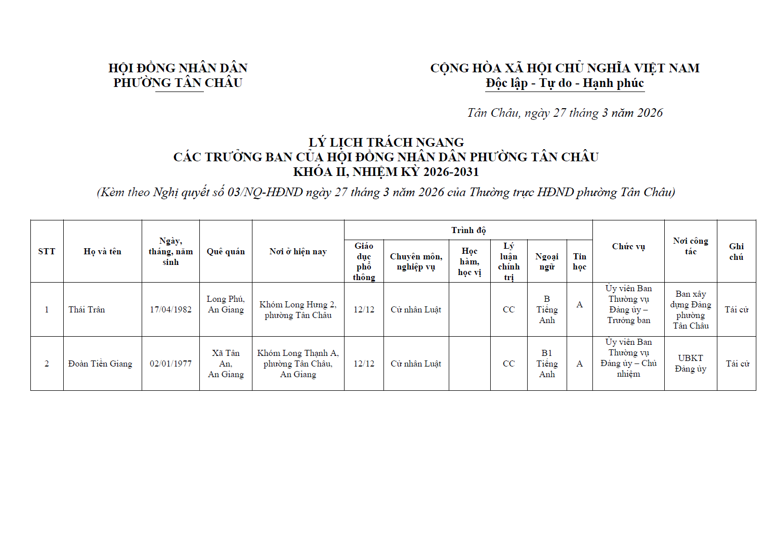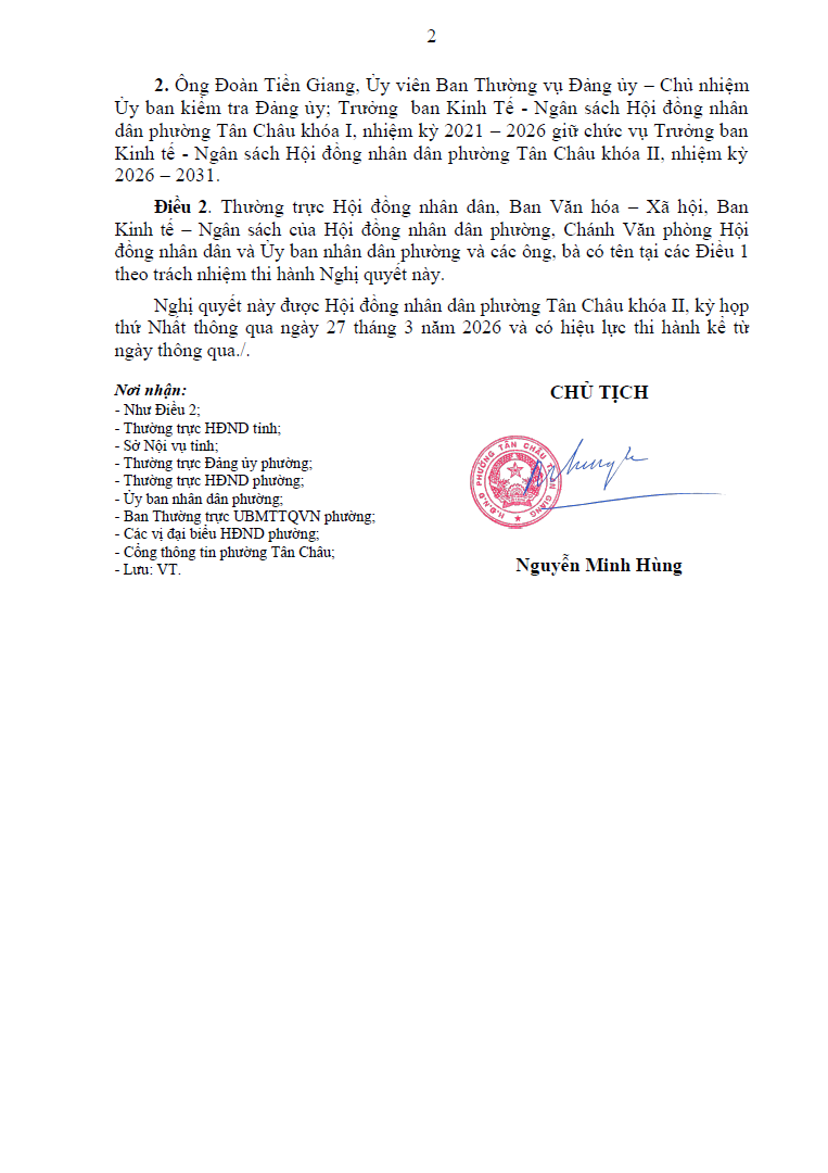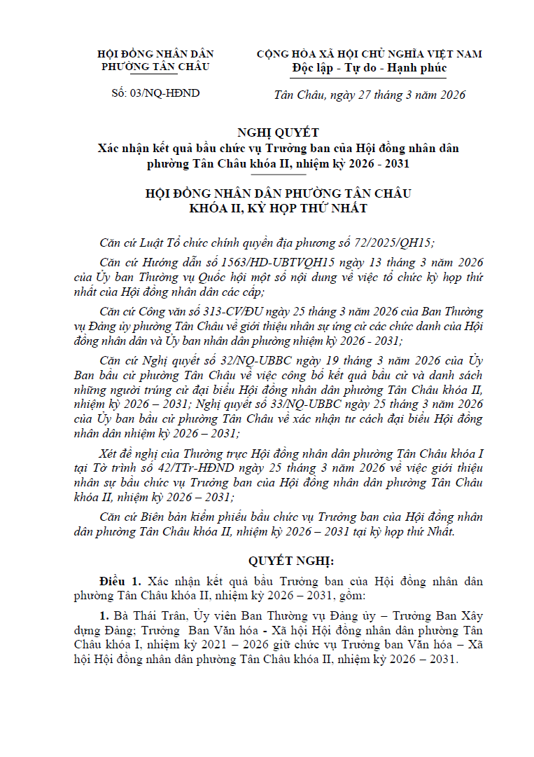 NGHỊ QUYẾT Xác nhận kết quả bầu chức vụ Trưởng ban của Hội đồng nhân dân phường Tân Châu khóa II, nhiệm kỳ 2026 - 2031