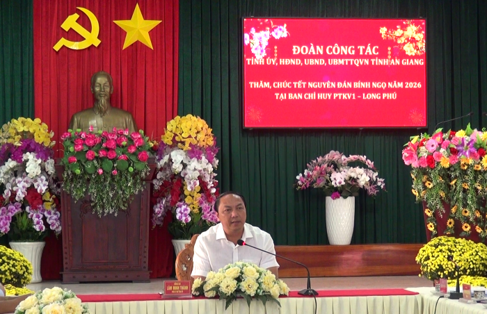 Nhân dịp Tết Nguyên đán Bình Ngọ năm 2026, sáng ngày 04/02/2026, Đoàn công tác của Tỉnh uỷ An Giang do đồng chí Lâm Minh Thành - Phó Bí thư Tỉnh ủy An Giang làm Trưởng đoàn đã đến thăm, chúc Tết các đơn vị lực lượng vũ trang, gia đình chính sách và người có công với cách mạng tại phường Tân Châu. Cùng đi có đại diện lãnh đạo Bộ Chỉ huy Quân sự tỉnh; Ban Tuyên giáo và Dân vận Tỉnh ủy; Công an tỉnh; Văn phòng Tỉnh ủy cùng các cơ quan, đơn vị liên quan, lãnh đạo Đảng ủy phường Tân Châu.