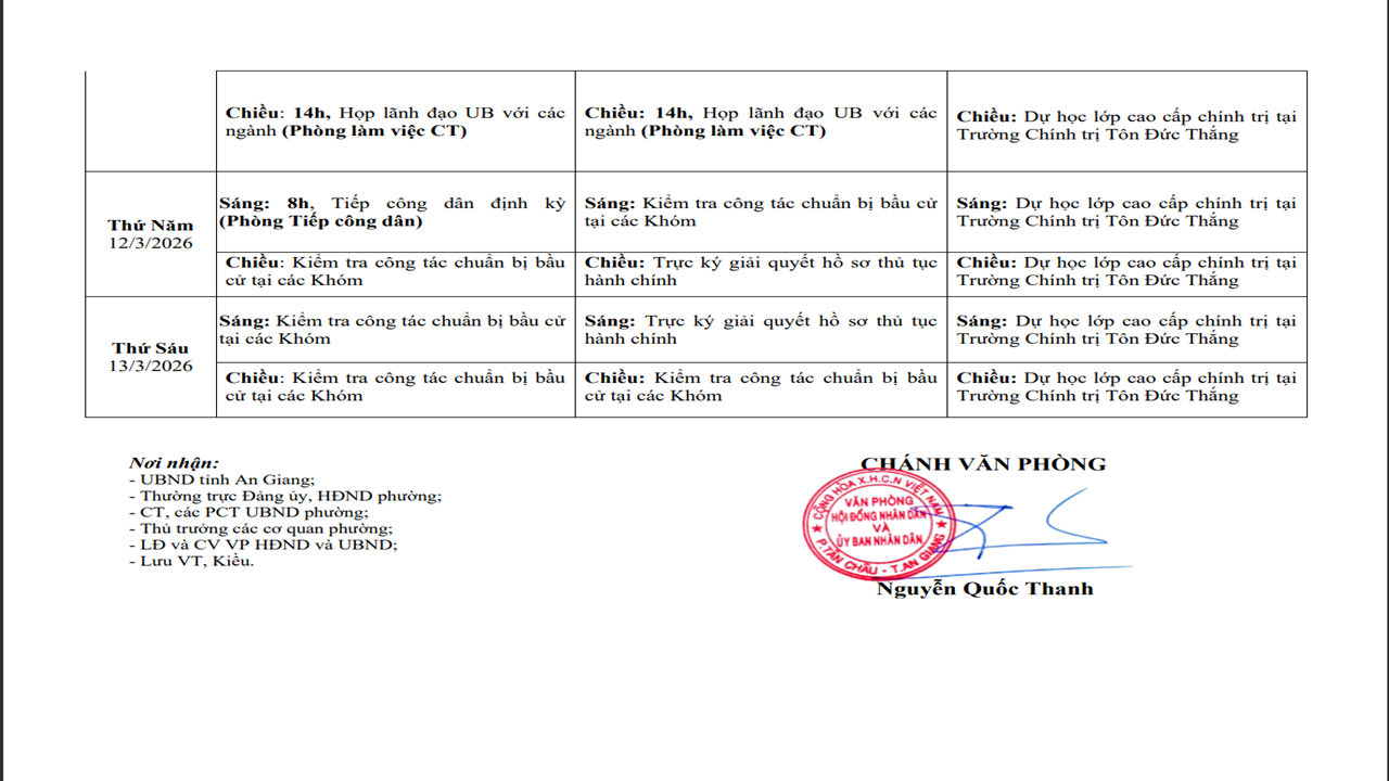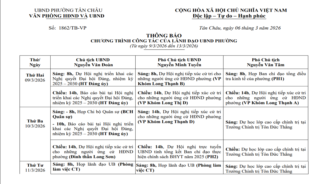 THÔNG BÁO CHƯƠNG TRÌNH CÔNG TÁC CỦA LÃNH ĐẠO UBND PHƯỜNG