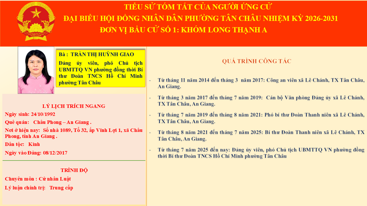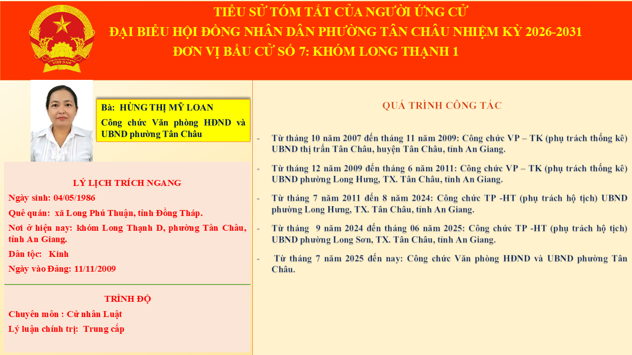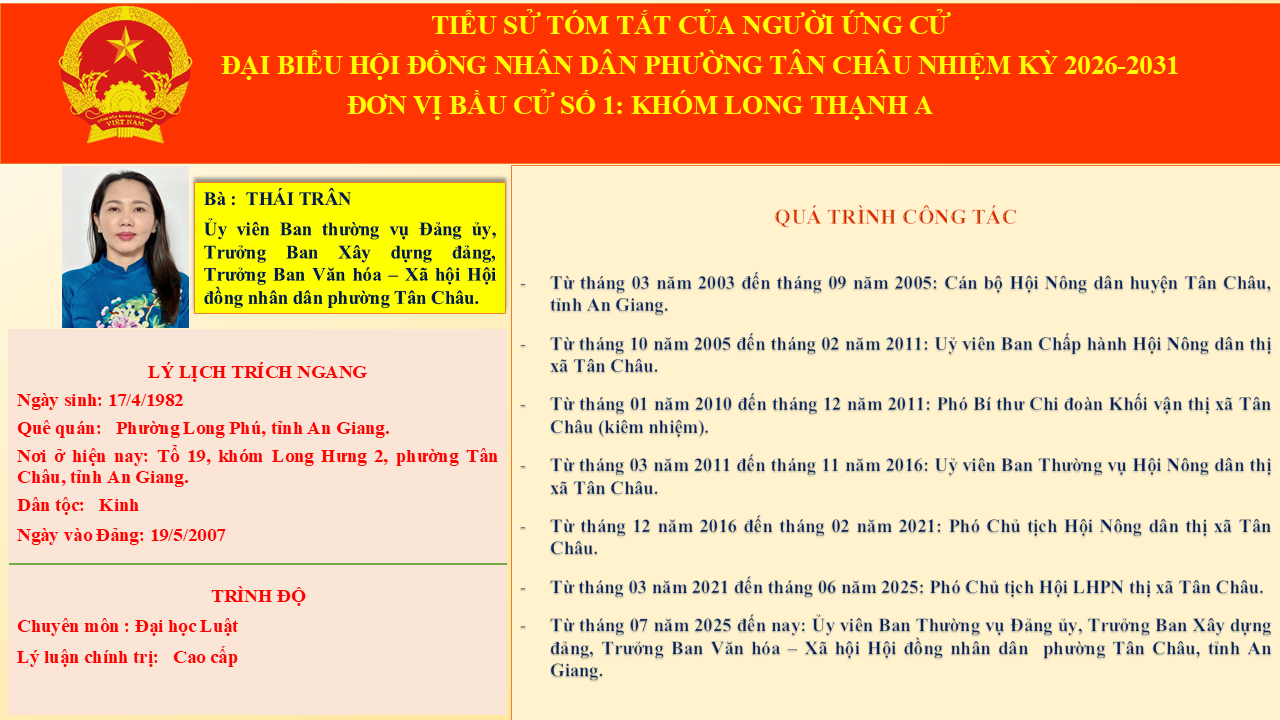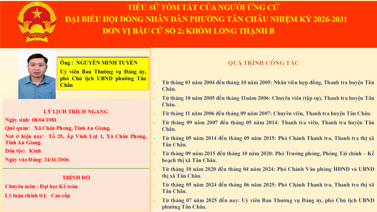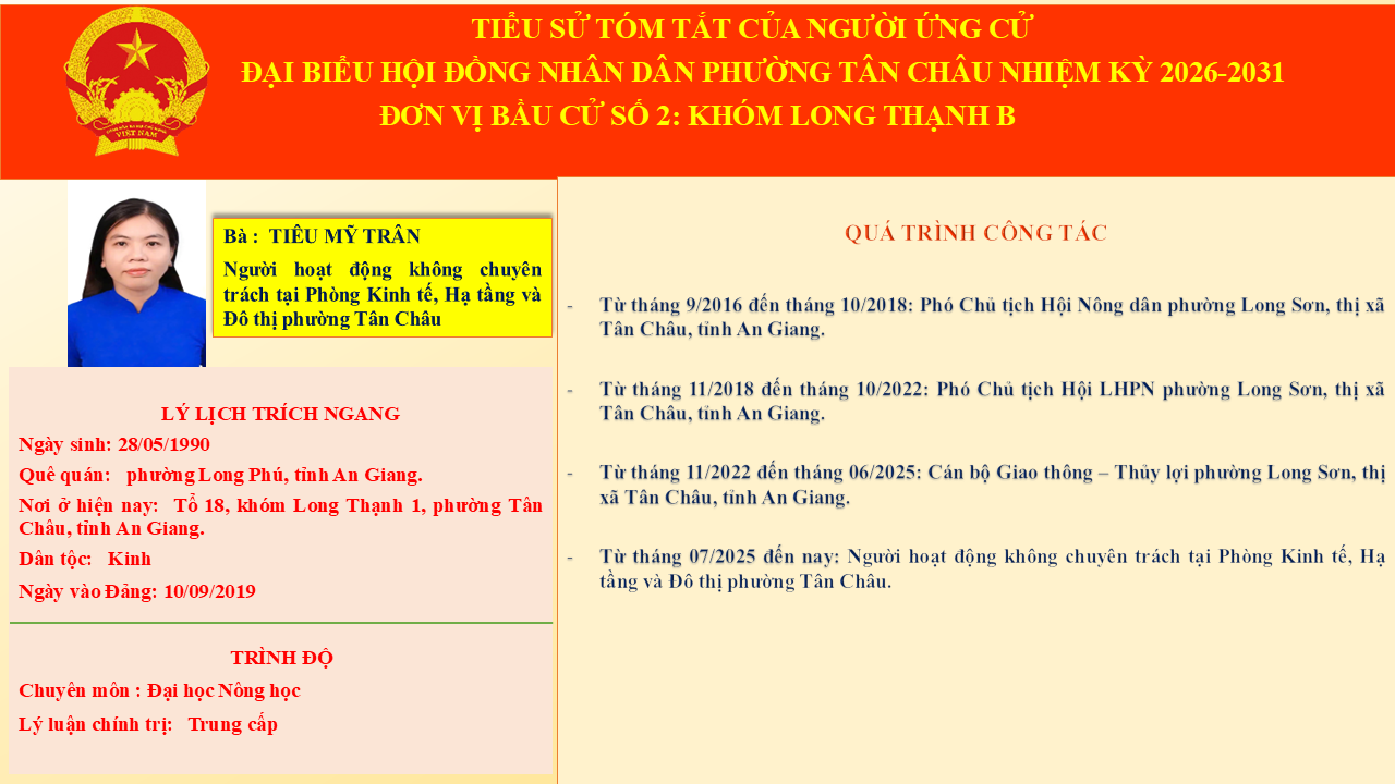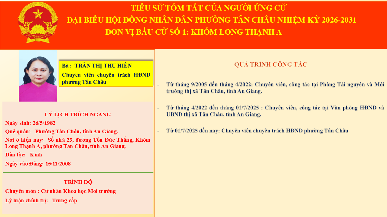 TIỂU SỬ TÓM TẮT CỦA NGƯỜI ỨNG CỬ ĐẠI BIỂU HỘI ĐỒNG NHÂN DÂN PHƯỜNG TÂN CHÂU NHIỆM KỲ 2026-2031