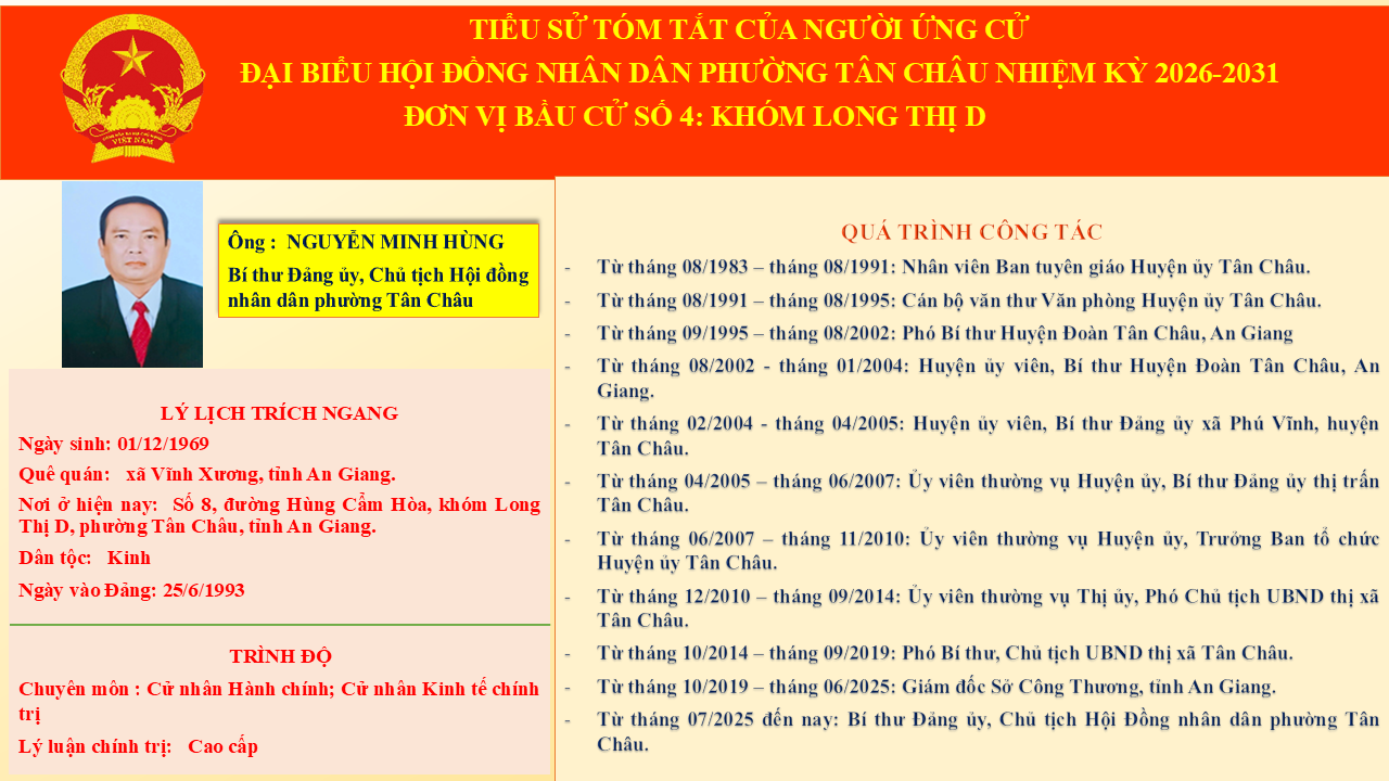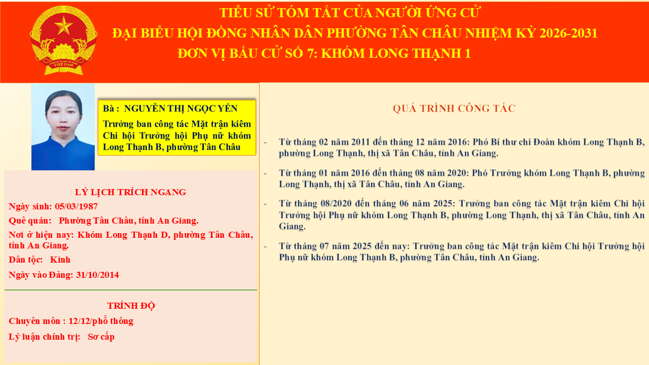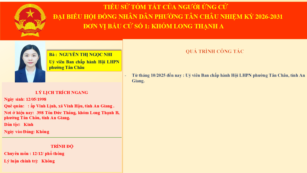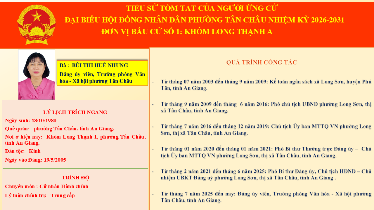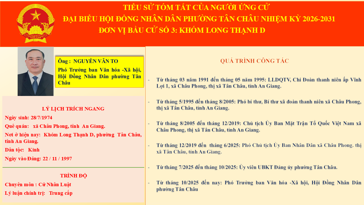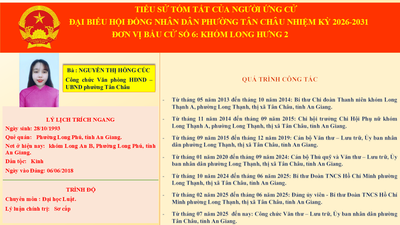 TIỂU SỬ TÓM TẮT CỦA NGƯỜI ỨNG CỬ ĐẠI BIỂU HỘI ĐỒNG NHÂN DÂN PHƯỜNG TÂN CHÂU NHIỆM KỲ 2026-2031