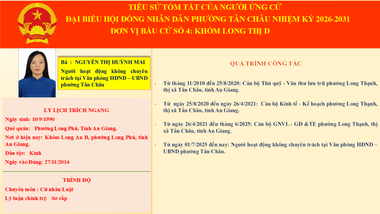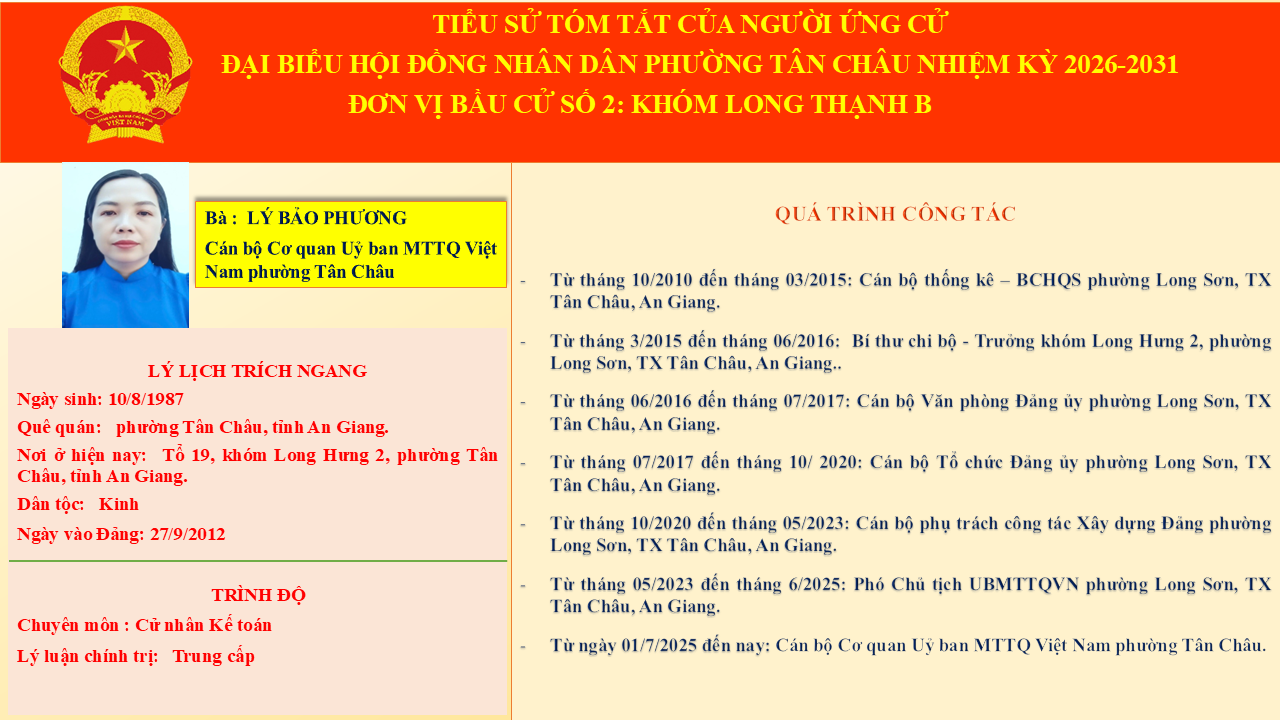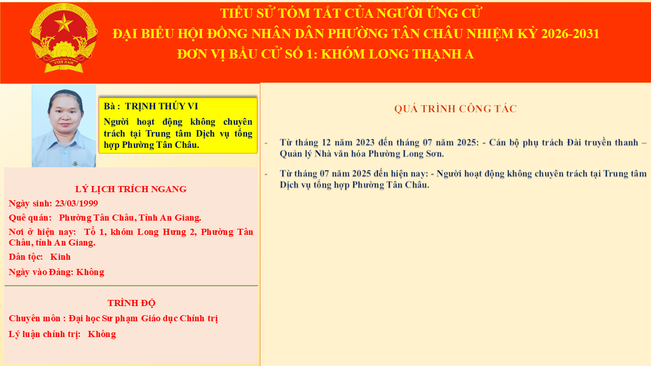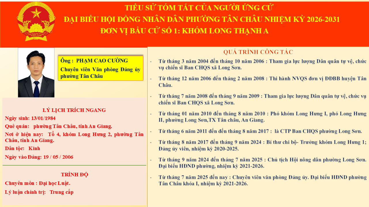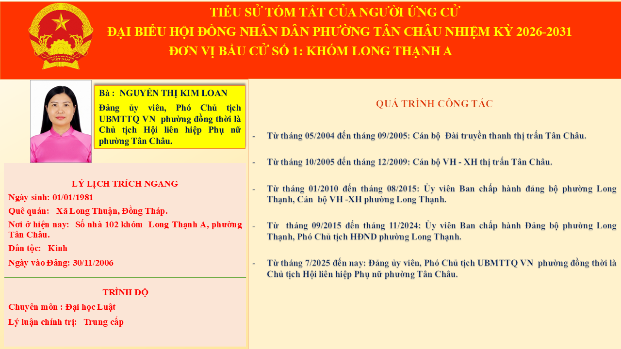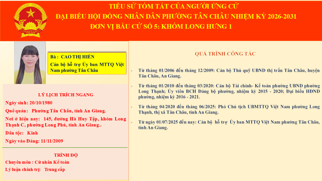 TIỂU SỬ TÓM TẮT CỦA NGƯỜI ỨNG CỬ ĐẠI BIỂU HỘI ĐỒNG NHÂN DÂN PHƯỜNG TÂN CHÂU NHIỆM KỲ 2026-2031
