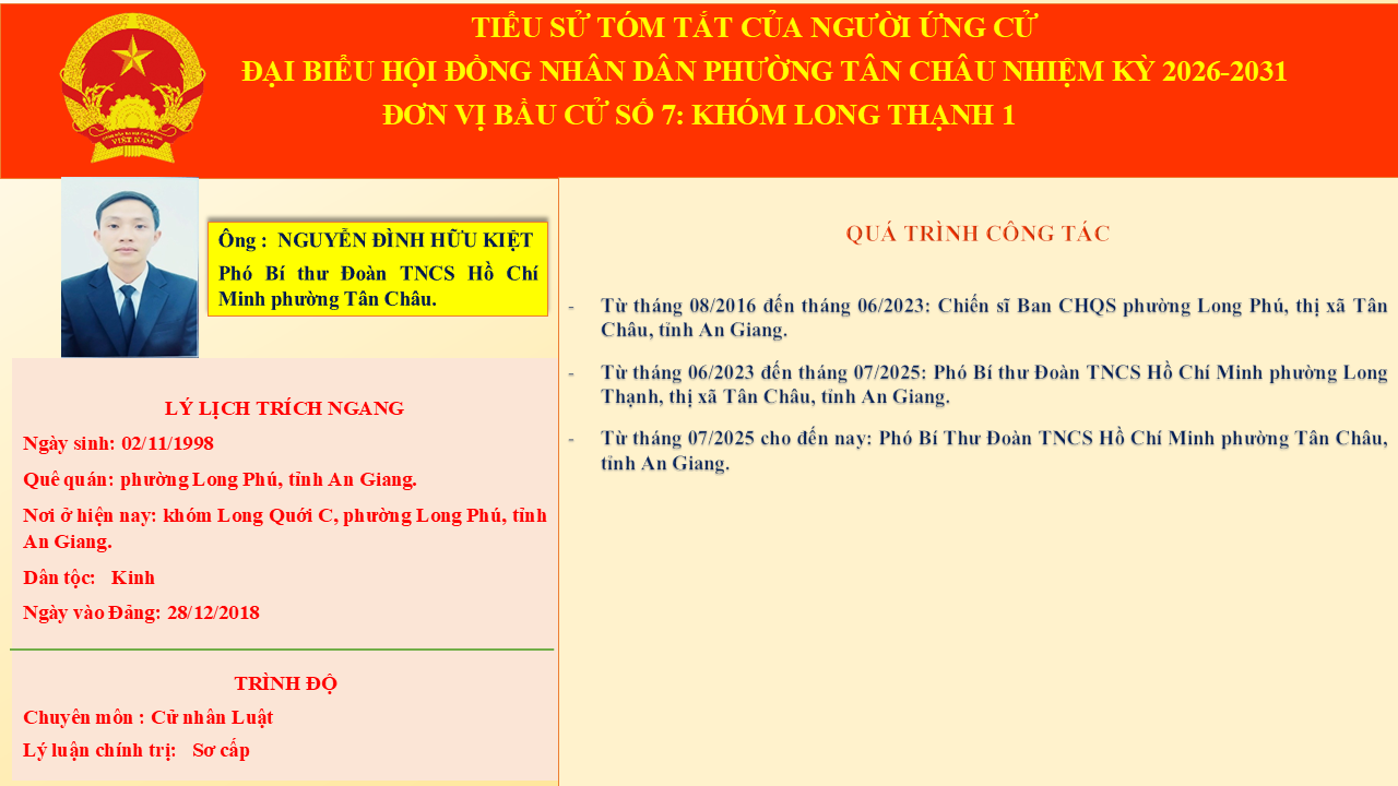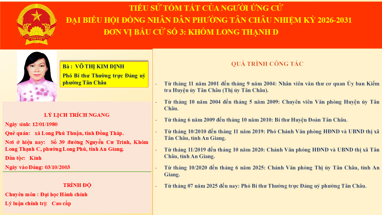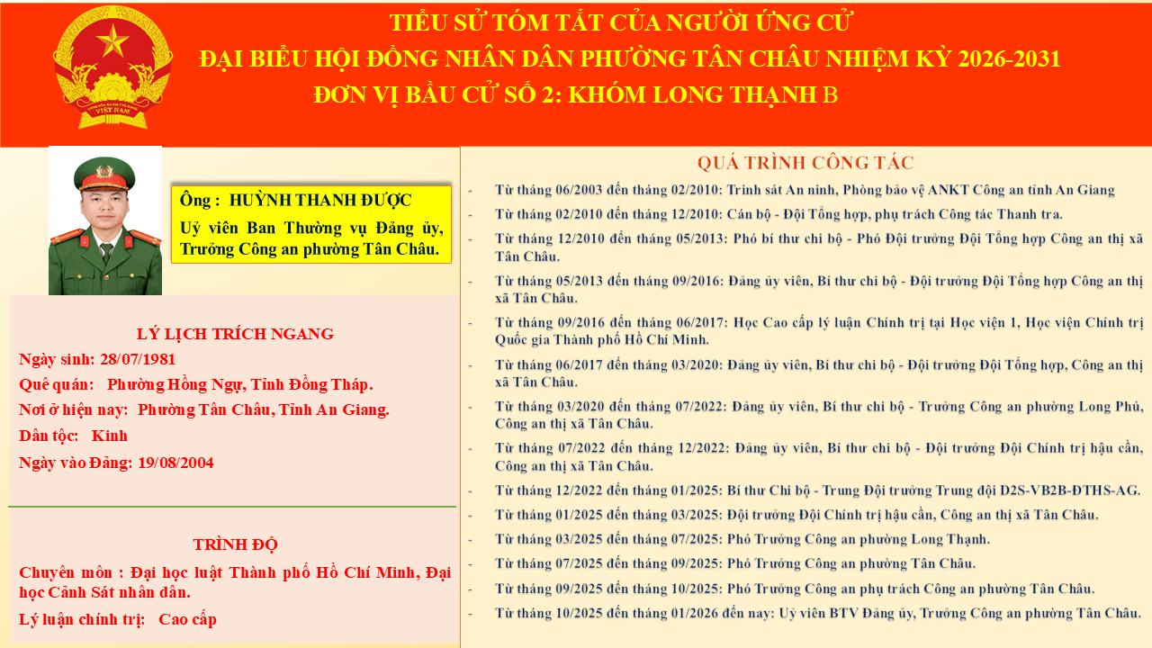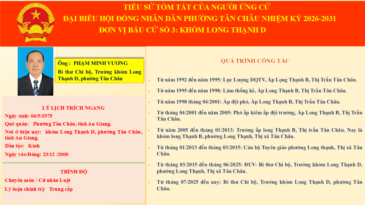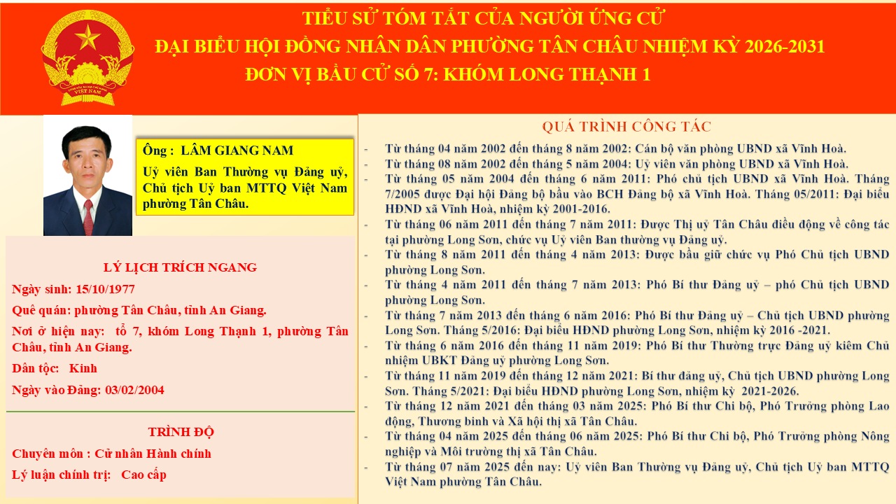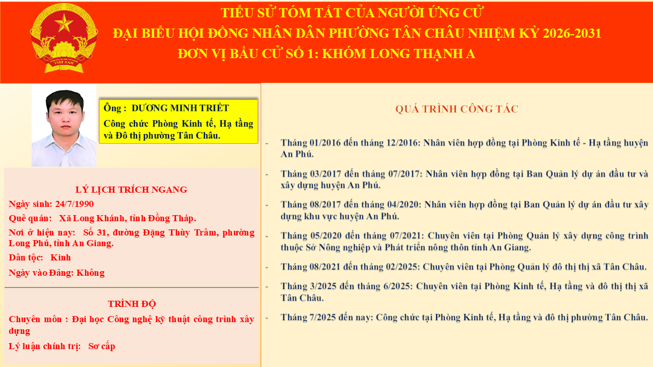 TIỂU SỬ TÓM TẮT CỦA NGƯỜI ỨNG CỬ ĐẠI BIỂU HỘI ĐỒNG NHÂN DÂN PHƯỜNG TÂN CHÂU NHIỆM KỲ 2026-2031
