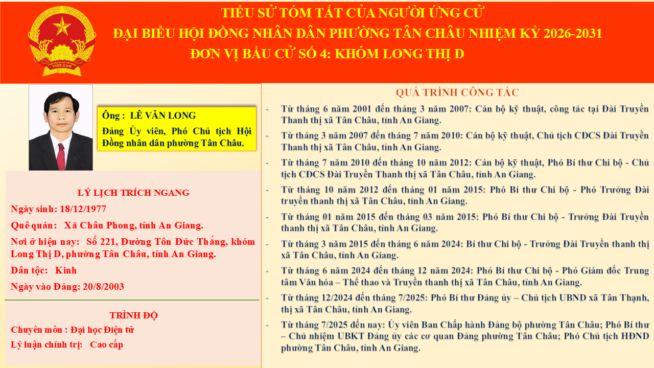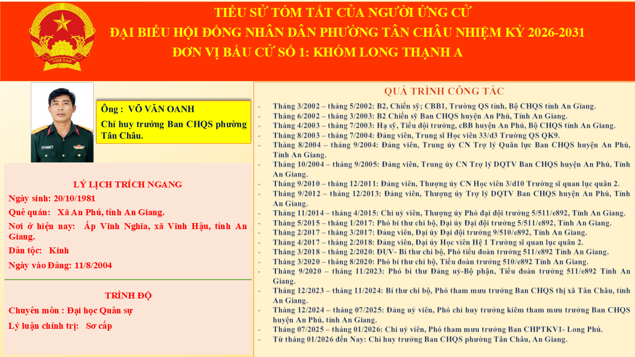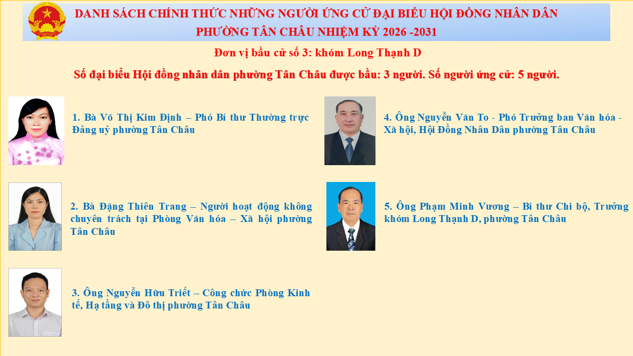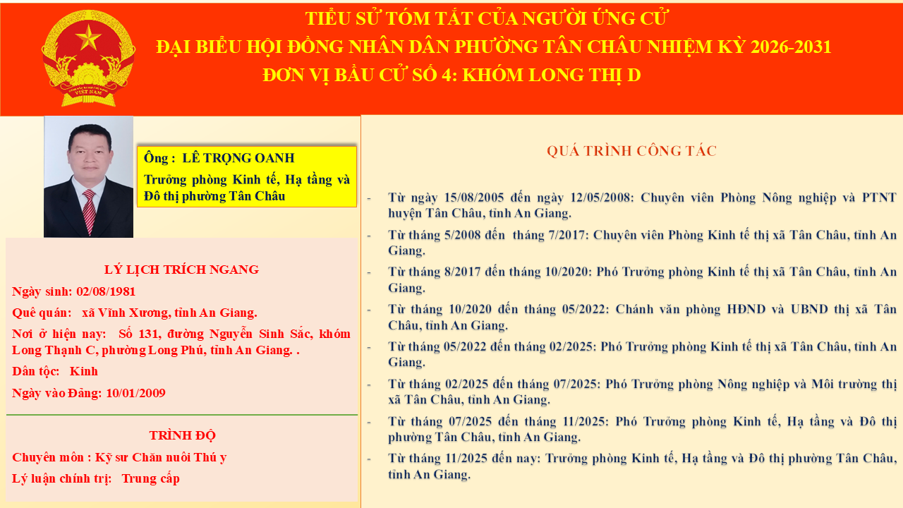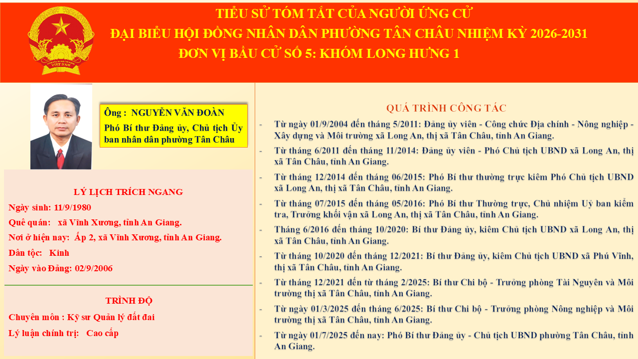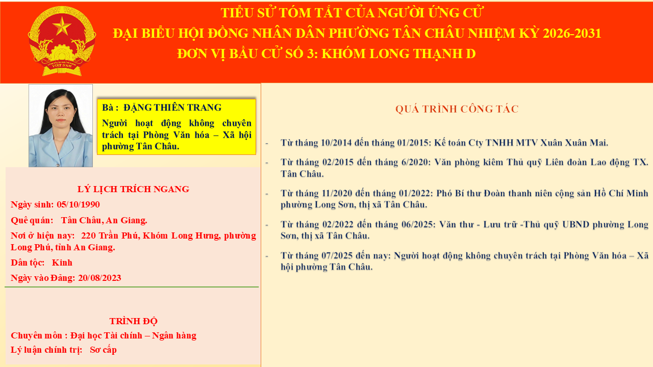 TIỂU SỬ TÓM TẮT CỦA NGƯỜI ỨNG CỬ ĐẠI BIỂU HỘI ĐỒNG NHÂN DÂN PHƯỜNG TÂN CHÂU NHIỆM KỲ 2026-2031