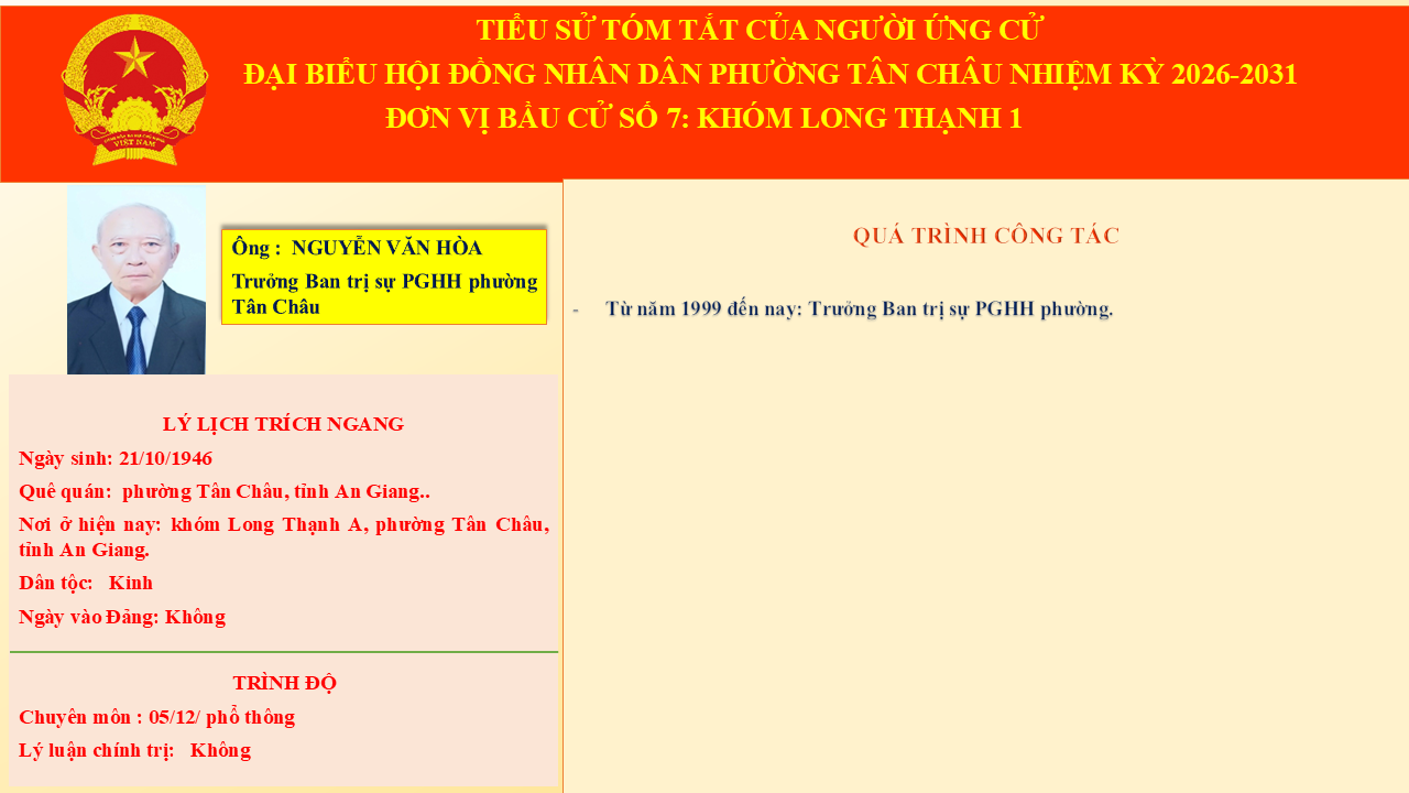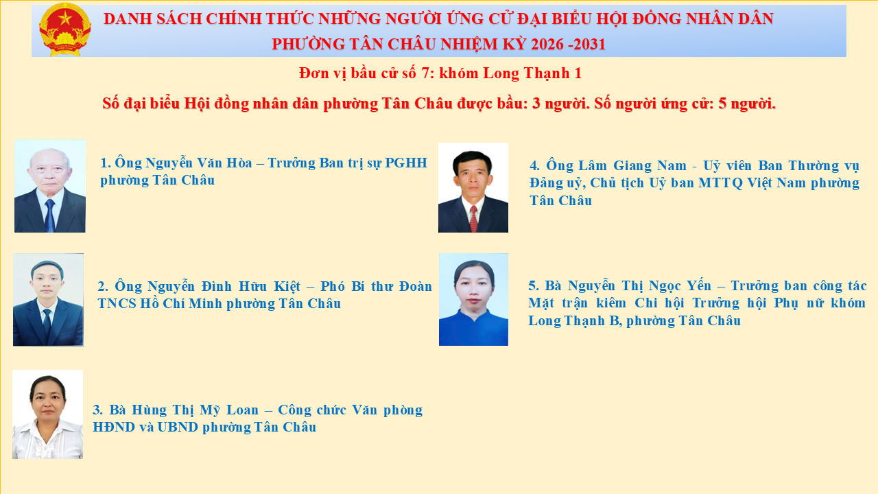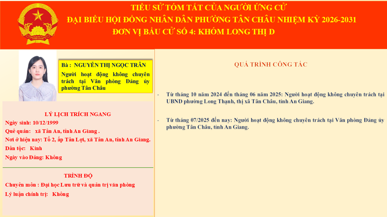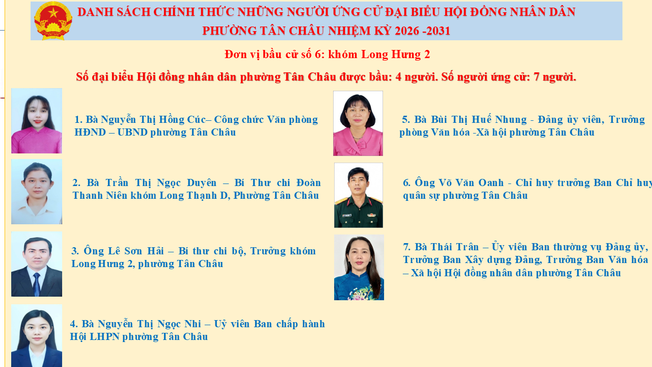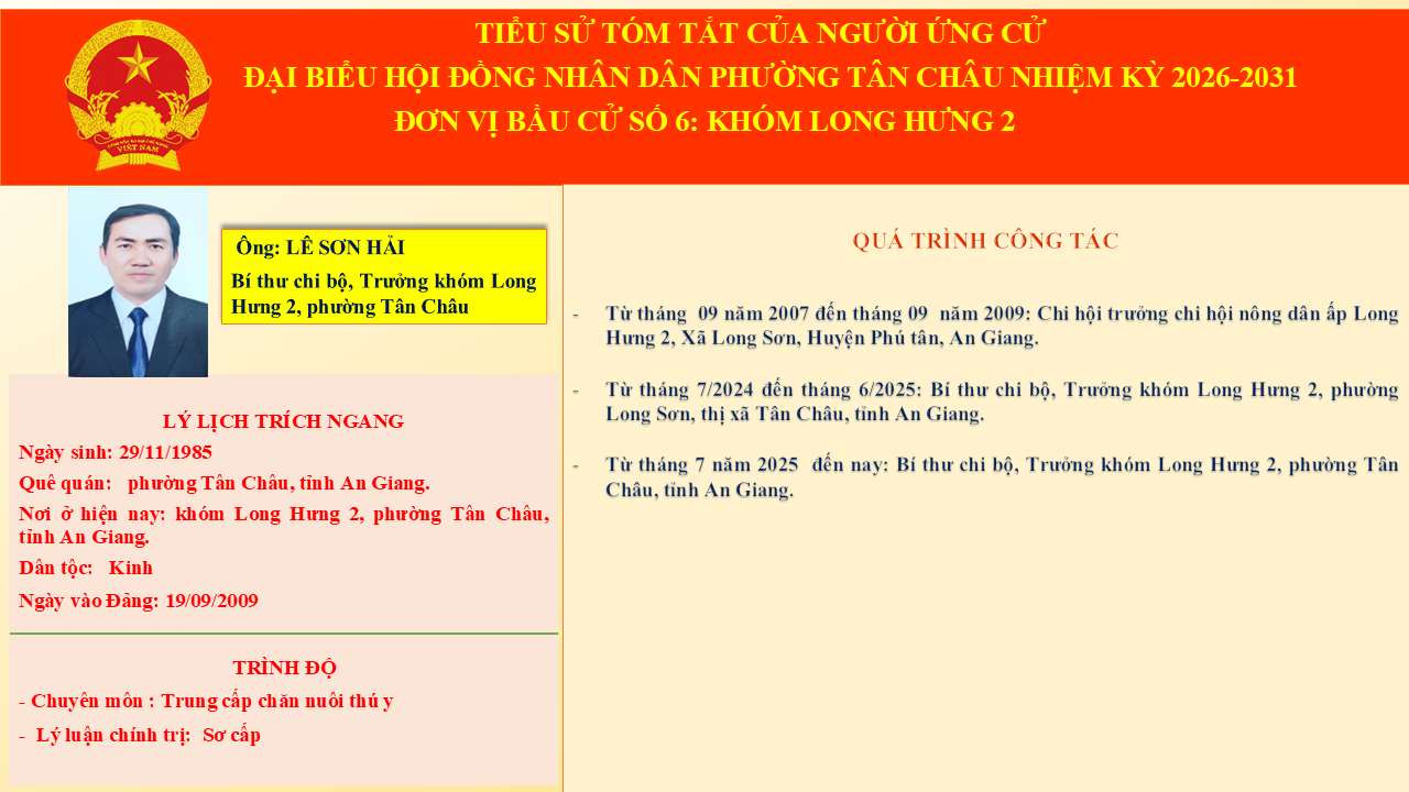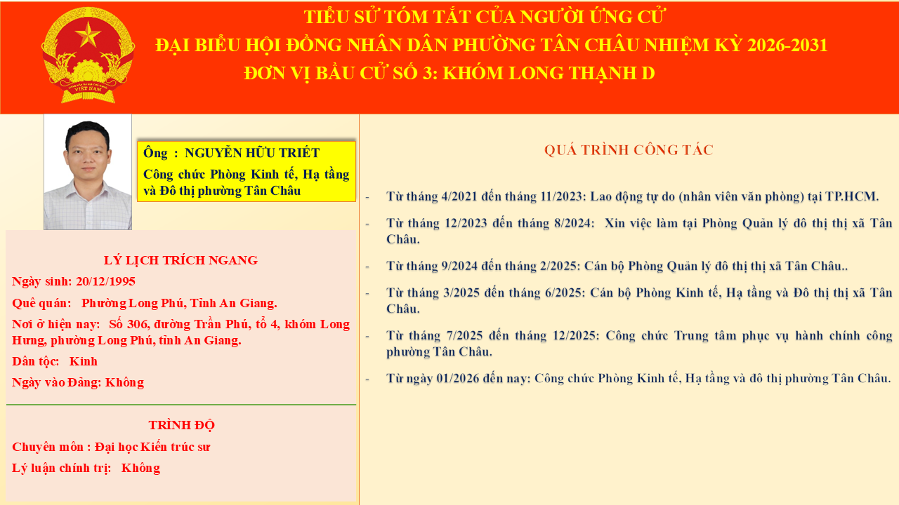 TIỂU SỬ TÓM TẮT CỦA NGƯỜI ỨNG CỬ ĐẠI BIỂU HỘI ĐỒNG NHÂN DÂN PHƯỜNG TÂN CHÂU NHIỆM KỲ 2026-2031
