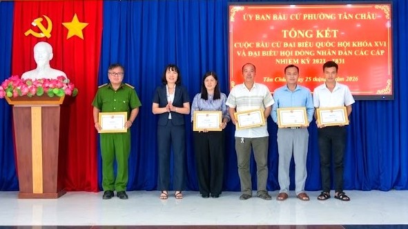 Dịp này, UBBC phường Tân Châu đã khen thưởng cho 6 tập thể và 20 cá nhân có thành tích tốt trong công tác Bầu cử Đại biểu Quốc hội khoá XVI và Đại biểu Hội đồng nhân dân các cấp nhiệm kỳ 2026 – 2031 trên địa bàn phường./.